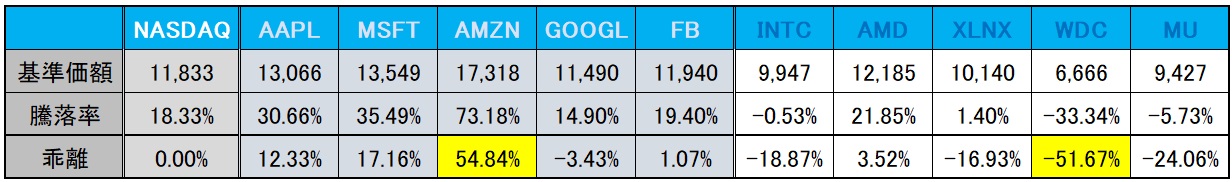 明らかに上位銘柄がNASDAQを牽引していると言える。誤解が生じないように、下記に個々の銘柄の騰落率と乖離の実数値をテーブルでご紹介しておく。