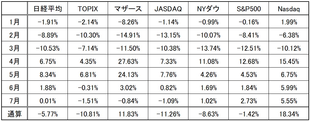 どの程度あっちもこっちもで歪(いびつ)が発生しているかを、日本と米国の代表的な株価指数の年初来の月別、通算の各騰落率で確認してみる。7月に関しては7月10日までの数字で計算してある。まず、表に目を縦に走らせて月毎の上昇か下落かという傾向値を比較すると、概ねベクトルの向きは同じになるが、表の横方向に目を走らせ月毎の各指数の変動率をみると、ベクトルの角度はかなりバラバラになっていることに気がつくだろう。6月以降は、正負の記号さえ違うことさえある。