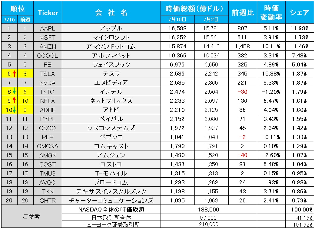 まず最初はNASDAQの時価総額上位20銘柄のリストと時価総額シェアを前回との差分をつけてまとめてみたのが下記の表だ。