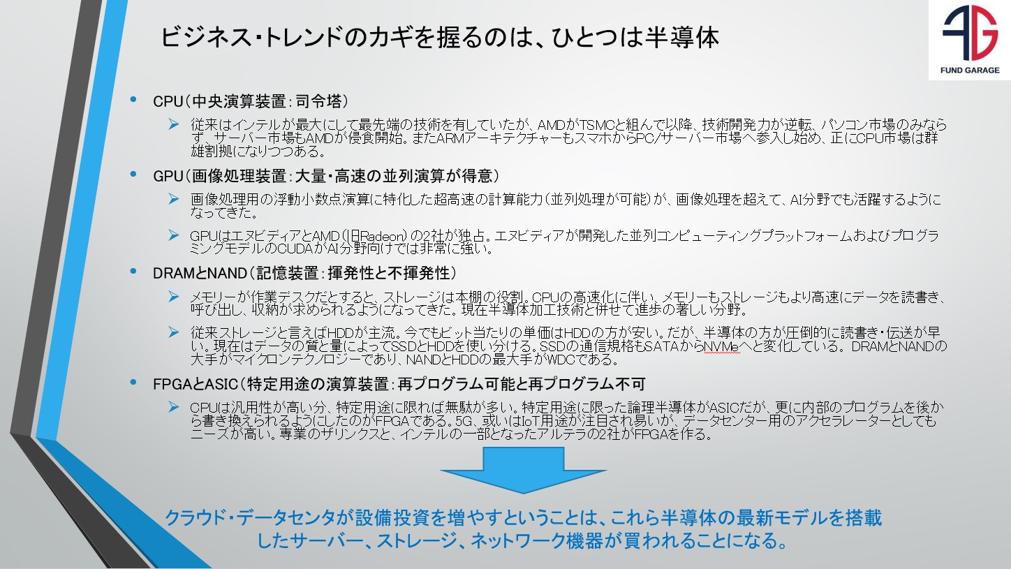 こうなるとこのビジネス・トレンドの成功のカギを握る重要な用層の一つが半導体だ。ただ半導体と一口にっても、その種類は多い。下記に示す4つのポチマークの6種類の半導体ぐらいについては、最低限の知識として、その名前と役割・機能ぐらいは押さえて置いて投資家として損はない筈。