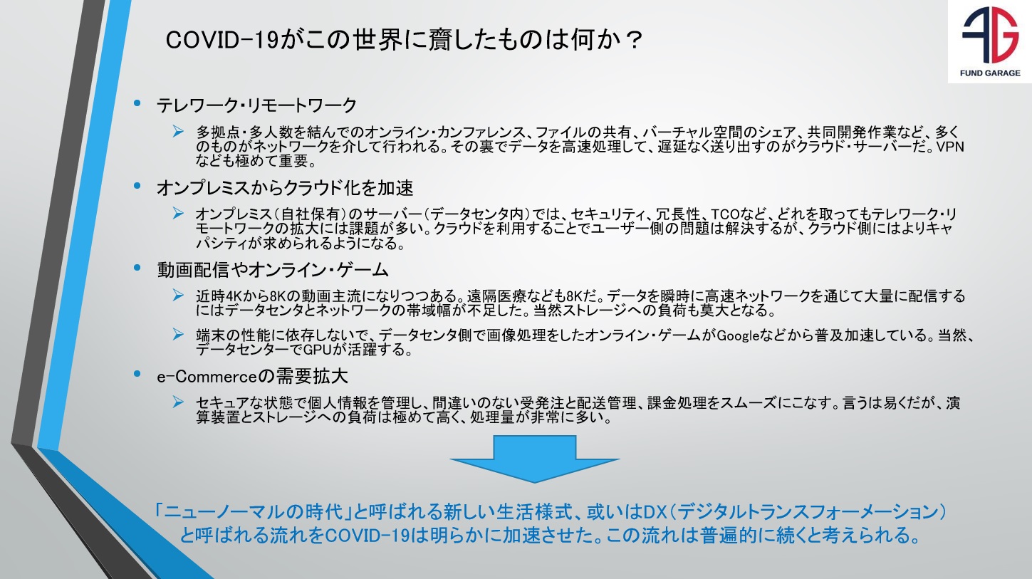 上記の流れはCOVID-19のパンデミックが起ころうが、起こるまいが、もう既に技術開発の流れからしても既定路線の「右肩上がりのビジネス・トレンド」だったが、COVID-19のパンデミックが起きてしまったことで、この流れは否応なしに加速させられた。勿論、多くの不自由も「ニュー・ノーマルの時代」に向かっては沢山出て来るだろうと思われる。だが、人間の素晴らしいところは、いつまでもその不自由さを甘受したままでいないことだ。きっとそれらも含めて克服するように進むのだろう。この流れは2,3年で終わる短いものでは無い。少なくとも10年単位で変革していく。ITバブルと呼ばれた2000年当時に夢見た世界が現実に近いものになるのに20年間は掛かった。それと同等の事、若しくはそれ以上の変化だとすると、もしかすると私はその最終着地点を天国から見ることになるような話かもしれない。