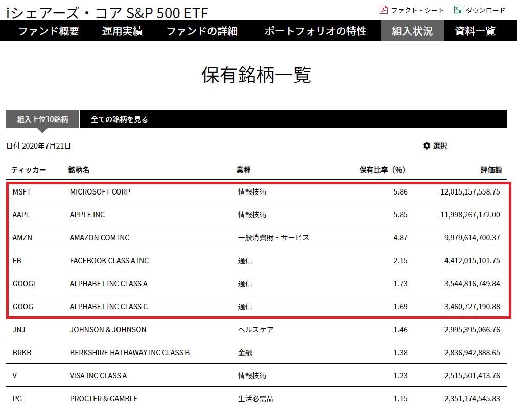 下の図は、このETFがどんな銘柄を組み入れているのかを調べたものだ。2020年7月21日現在の上位10銘柄とある。ご覧頂きたい。どこかで見慣れた銘柄が上位にずらっと並んでいないだろうか?なんと赤枠で囲った中の6銘柄5企業の株だけで全体の22.15%にも相当する。そう、この6種5企業、そのままピッタリNASDAQの上位銘柄だ。