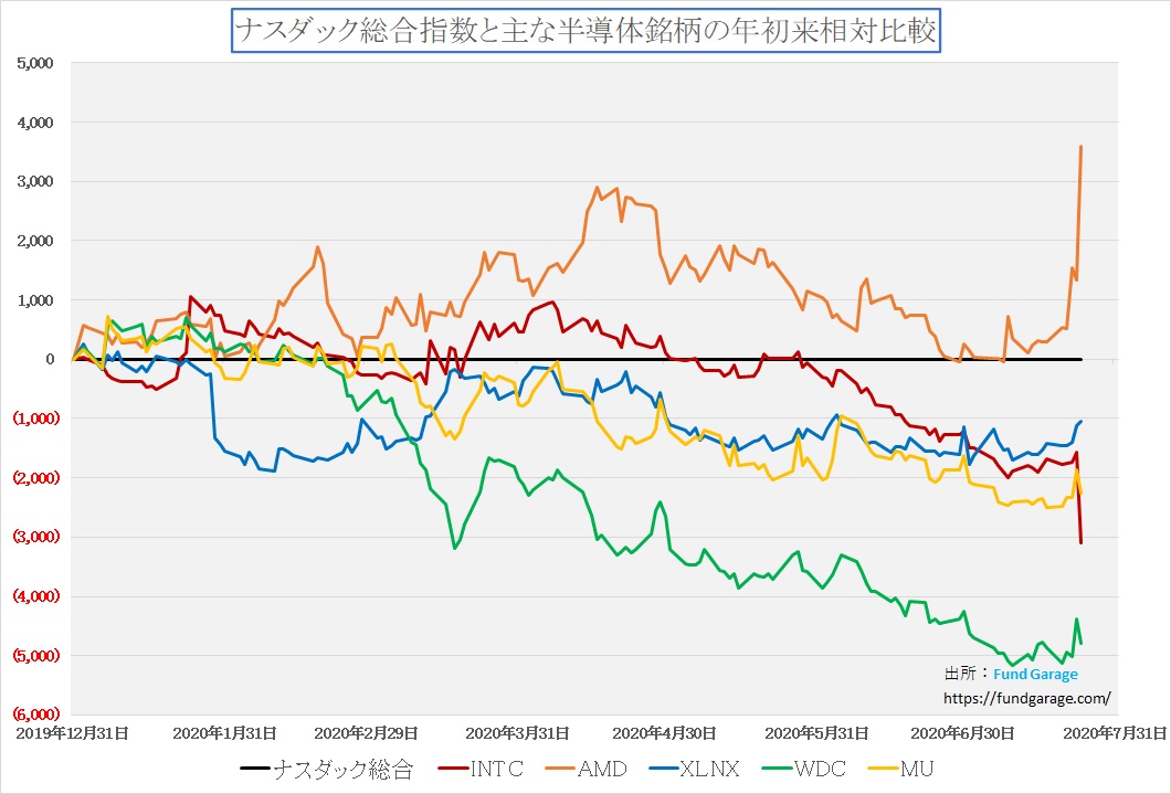 現地時間23日(木曜日)までは、NASDAQが下がっても、半導体銘柄はジワジワと全体に上昇を始めていた。ところがインテルの決算発表を受けた翌日、赤線で示したインテルは大きく下落する一方で、オレンジ色のAMDが急騰した。これはNASDAQ指数に対する相対評価であるから、如何にインテルとAMDが明暗を分けたかをご理解頂けると思う。ただ解せないのはメモリーであり、データストレージの半導体メーカーであるマイクロン・テクノロジーとウェスタン・デジタルも連れ安をしている点。この連想は現時点で私には分からない。世界最大の半導体製造装置メーカーであるアプライドマテリアルズの株価が売られたのは分からなくも無いが。だがインテルが内製しようが、サードパーティーが作ろうが、処理するべきウェハの枚数は変わらないので、今日のところはアプライドマテリアルズなども道連れになった被害者と言えよう。
