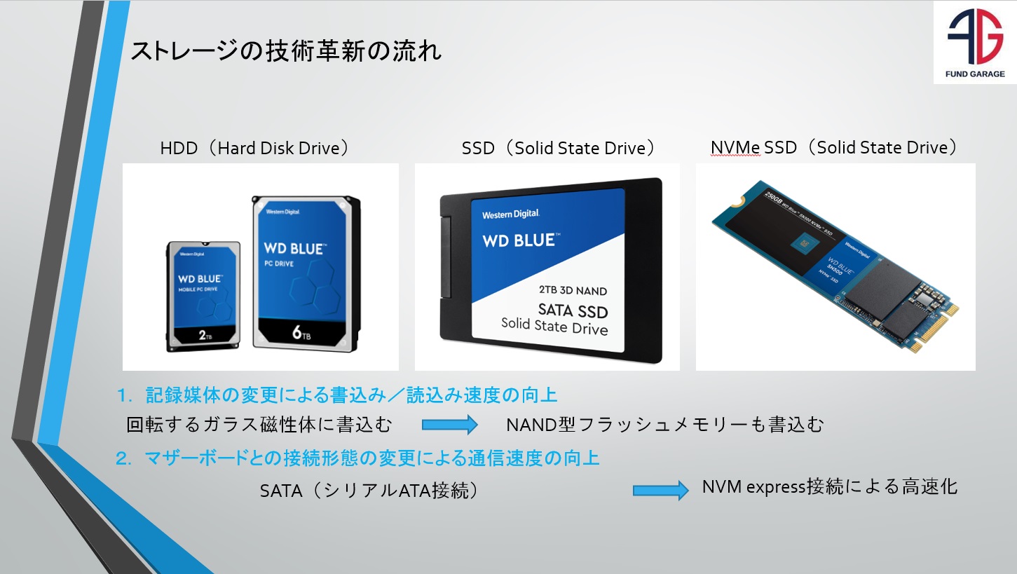 さて、この写真を見てご想像頂けるだろうが、円盤が回転して、針がデータの保存場所を探して、そして読書きをするというだけで、物理的にそのデータの取扱い速度、つまりどの位の時間で読み込んで来たり、書き込んだりできるかを想像すれば、きっとそんなに早くないだろうなということはお分かり頂けるだろう。それでも昔に比べれば随分と早くなったし、データの記録密度も格段に引き上げられたため、最新のウェスタン・デジタルが提供するHDDは1台の3.5インチHDDでなんと18TBものデータを収納する能力がある。