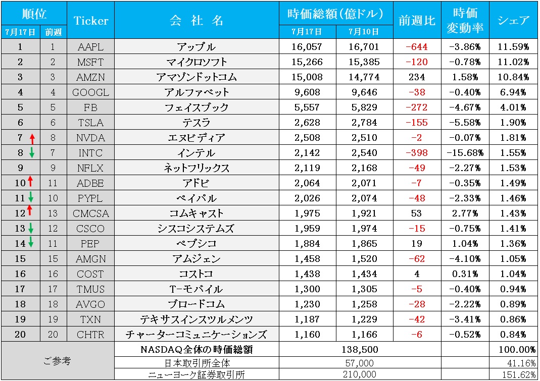 参考までに、この一週間でNASDAQの上位20銘柄にどういう変化があったかを下に示す。