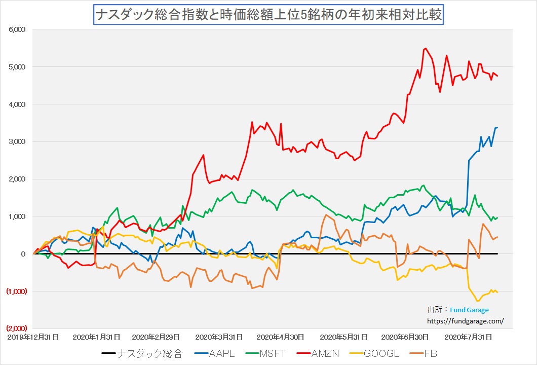 下のチャートはこの上位5銘柄とNASDAQの動きを示したもの。ナスダックの上昇に年初来貢献しているのかいないのかがひと目でわかる。ただ今回見て欲しいのは、各ラインの最後の約2週間分程度のところだ。