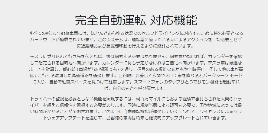 ただ同時に、下記の記載があるのも事実。つまり法整備の問題以外はテスラは対応済みということだ。是非、下記画像をクリックして、同社のオートパイロットのページに飛んでみて欲しい。どこからどこまではリアルなのかは正直私には担保出来ない。ただこうした点が、テスラの時価総額をトヨタ自動車以上に持ちあげた要因かも知れないとは思う。実際にその状態で乗ってみないと何とも言えないからだ。ただまたしてもこの文言に嬉しくなった。「ワイヤレスによるソフトウェアアップデートを通じて、お客様の車両は将来も継続的にアップグレードされていきます。」ということ。FPGAのプログラムを書き換えるのでなければ、パソコンで言えばCドライブにデータを送ることだ。いずれにしても、今見ているビジネス・トレンドに誤りはない。