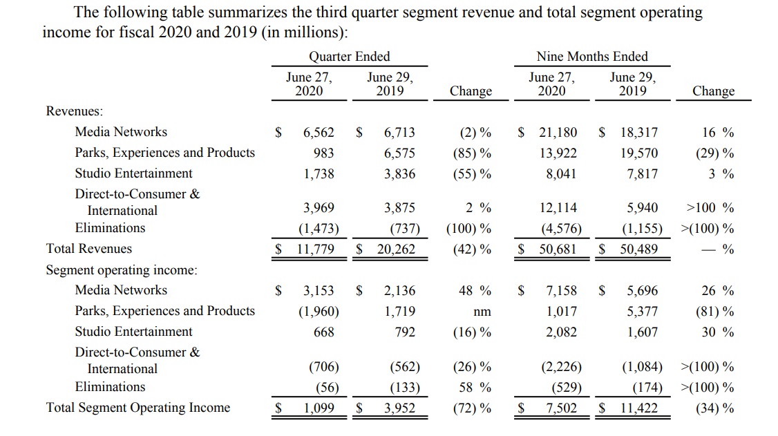 下記が先日発表になったディズニーの決算書の一部だ。同社のビジネスはディズニーランドだけでは当然ない。下記にある「Parks, Experiences, and Products」に正に世界中のディズニーランドの収益が記載されているが、対前年比で見て△85%もマイナスだ。勿論COVID-19のパンデミックの影響で閉園しているからだが、逆に「Direct-to-Consumer and International」のセグメントでは収益が対前年比でプラスになっている。実はこれがコンテンツ・ビジネスの底力だ。