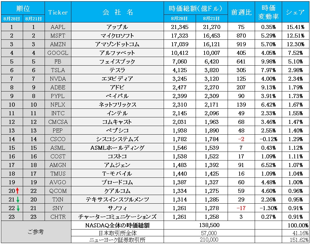 念のため、下記にNASDAQの時価総額上位銘柄のこの一週間での時価変動を計算したエクセルシートをお見せするが、アップル(AAPL)を除く上位5社、MSFT、AMZN、GOOGL、FBの時価総額の膨らみ方はやや異常だ。