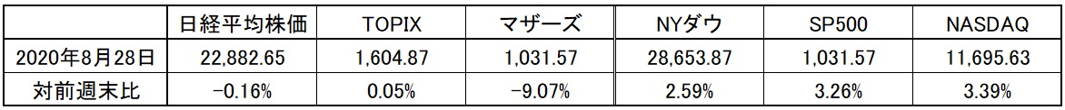 日米各株式市場の先週の終値と週間騰落率