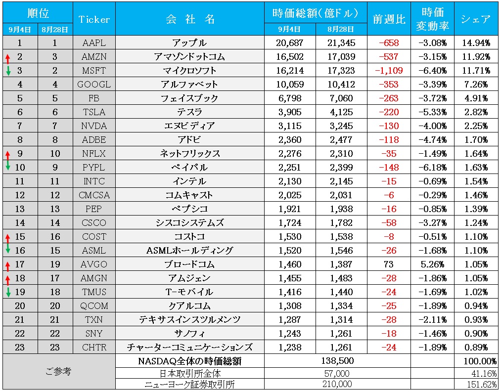 先週のNASDAQの騰落率は△3.27%のなので、それ以上の下落率の銘柄はNASDAQに負けたことになる。中でもその約2倍にあたる△6.40%もの下落率を演じたマイクロソフトは先週の米国株式市場ではかなりな悪役扱いだろう。マイクロソフト(MSFT)がNASDAQの構成銘柄として大きな影響力を持つことは当然のこととして、NYダウの30社の中にも、S&P500の時価総額上位にも含まれているからだ。全指数の足を引っ張っている。
