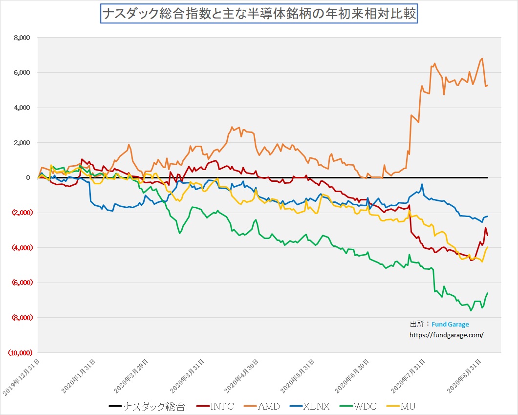 下のチャートは年初来の半導体銘柄の主要どころをナスダックの変化率と相対的に比較したものだが、直近でややAMDが下がり、赤線のインテルが上昇している。WDCとMUも上昇しているが、AMDとインテルは競合関係であるので、この相関性はおもしろい。