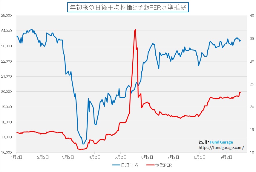 例えば9月16日の日経平均株価は終値23,475円で翌日の朝刊が発表した予想PERは22.29倍。そして週末時点の日経平均株価の終値は23,360円で土曜日の朝刊に発表された予想PERは23.25倍。株価は115円下落したにも関わらず22.29倍から23.25倍へと約1倍上昇している。上のチャートでは青が日経平均株価、赤が予想PERである。東証1部全銘柄の週末時点の予想PERは25.02倍となる。