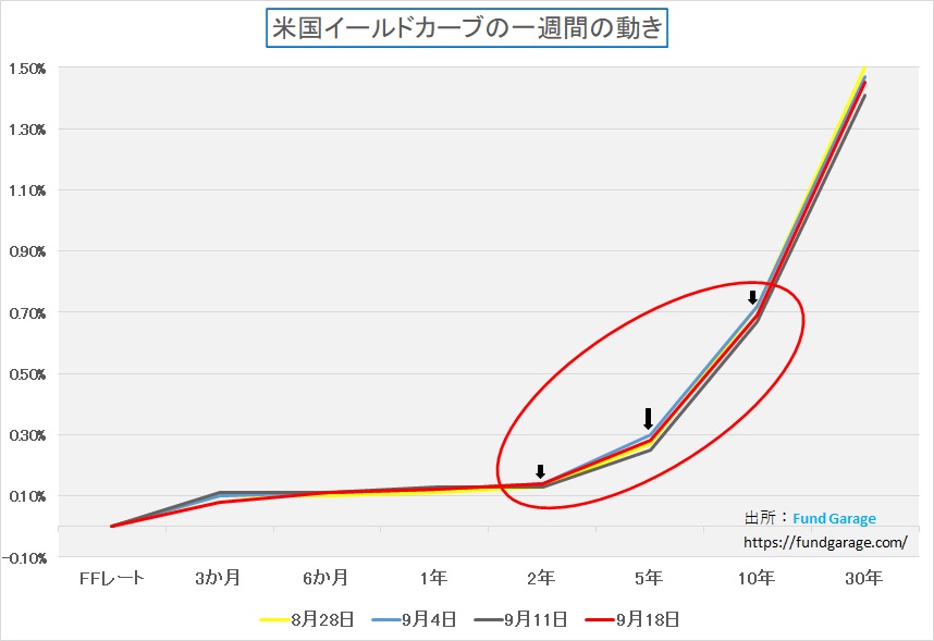 実際、米国の金利情勢は殆ど全く動いていない。電子顕微鏡で見れば勿論上下しているが、「金利上昇ですね」或いは「金利低下ですね」と言えるようなものではなく、イールドカーブの形状自体が動いていない。参考までにそのチャートお見せする。過去4週間分の週末時点のイールドカーブだ。4色で描かれているが、それぞれを見極めるのが難しいぐらいに全部が重なっている。