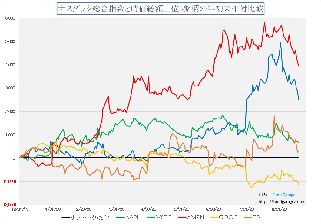 ただ上の表でも明らかな通り、先週一週間だけで言えばNASDAQよりもSP500の下げの方が若干大きい。まずは何が下落したのかだが、下のチャートを見て貰えれば一目瞭然だ。米国企業の時価総額上位5銘柄が引き続き軟調に推移したのだ。黒線がNASDAQを現し、その他5本の線が、アップル、マイクロソフト、アマゾン、グーグル、フェイスブックと米国企業の時価総額上位5銘柄が対ナスダックで相対的にどう動いたかを示している。明らかに9月に入ってからこれら5銘柄がNASDAQの下落をリードしている。何せこの5銘柄だけでNASDAQの時価総額の半分以上を占めるのだから。S&P500に対しても、足許ではなんと23%もの時価総額を占める。両指数とも時価総額加重平均の株価指数なので、これらの下落影響はかなり大きくでる。ただ逆に、指数の上昇にこの5銘柄の上昇が寄与していたことも確かだ。