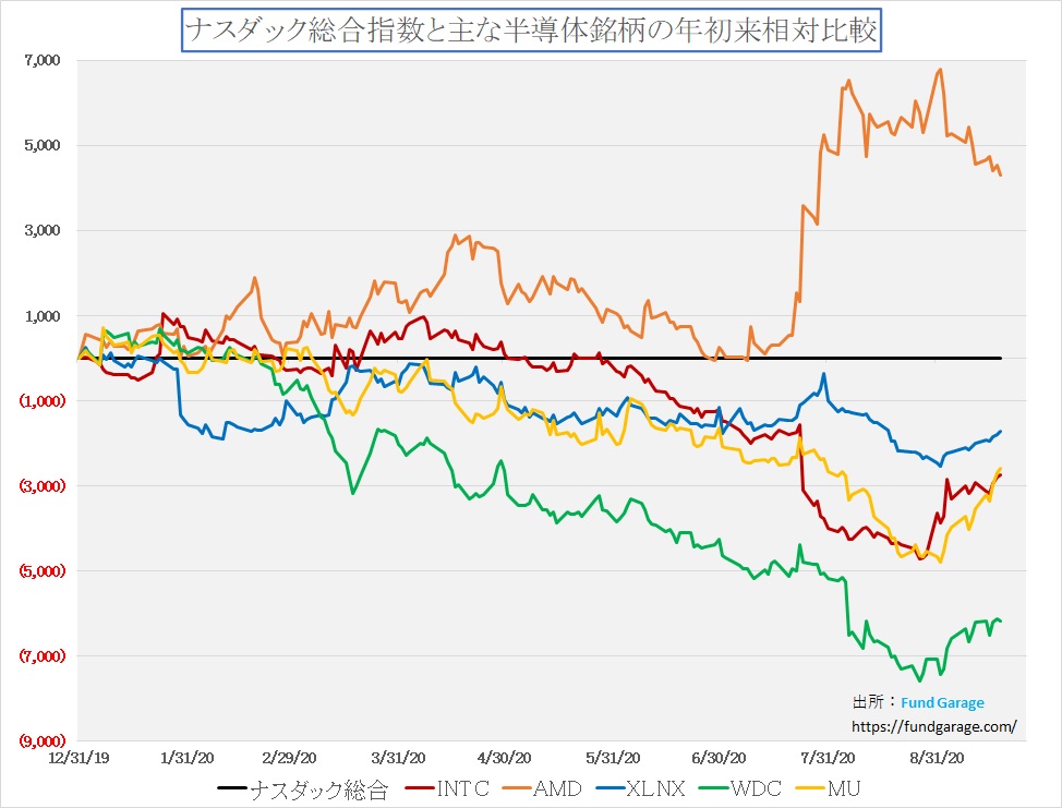 その一方でもう一枚、次のチャートを見て欲しい。上のチャートと同じ要領で、ハイテク株の典型である半導体銘柄で比較チャートを作ってみたものだ。驚くなかれ、半導体銘柄はこの間にNASDAQをアウトパフォームし、NASDAQが下がることに抵抗している。