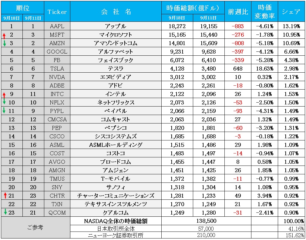 因みに、NASDAQ総合指数を例にとれば、これは米国NASDAQ市場に上場する全銘柄3000以上から計算される時価総額加重平均の指数ではあるが、上位5銘柄で約5割、上位10銘柄で約6割、上位20銘柄で約7割の時価総額を構成する実に歪な指数になってしまっている。論より証拠、この表を見て欲しい。銘柄の順番は9月18日の時価総額だ。NASDAQの上位23銘柄を並べてある。知らない企業もあるとは思うが、果たして伝統的な感覚で、或いは一般常識的な感覚でハイテク株と呼ぶのに相応しい銘柄はどれとどれだろうか?逆に明確に相応しくない銘柄は入っていないだろうか?