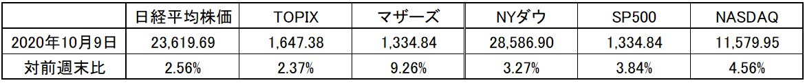 日米各株式市場の先週の終値と週間騰落率