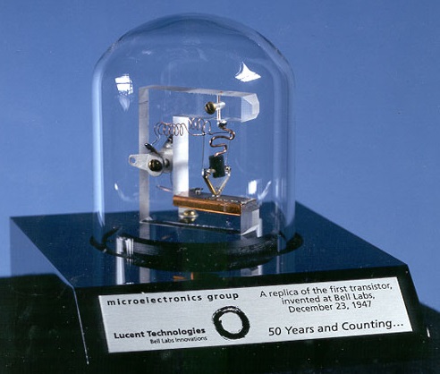 コンピューティングの歴史は常に中央集権化と分散化の繰り返しだ。それはまだトランジスタが登場する前の真空管の時代に、今のスマホよりも格段に演算能力が劣るコンピューターを作るのでさえ、体育館並みの広い空間が必要だったことから紐解けば理解も早いだろう。1947年にベル研究所がトランジスタを発明すると、まず真空管を使う必要がなくなり、多少コンピュータは小型化されるようになった。と言っても、初期のトランジスタはまだまだかなり大きい代物だ。下の写真がベル研究所の流れを汲むルーセントテクノロジー(現アルカテル・ルーセント)で作られたそのレプリカだが、これでトランジスタ一個である。