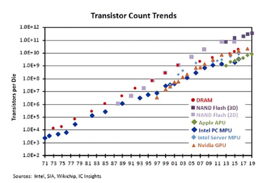 下の図は、トランジスタの搭載数が時代と共にどのように増えてきたかをチャート化したものだ。横軸が年代。縦軸がトランジスタの数を現すが、これはゼロの数を現している。つまり「1.0R+10」は1の後ろにゼロが10個付いていることを示している。現在は約10個から12個のゼロがつく時代。ゼロが10個で100億、12個で1兆だ。
