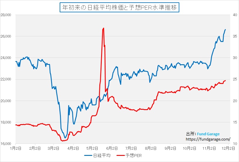 そしてもうひとつ、心穏やかで見ていられないのがバリュエーションの上昇だ。現在、日経平均株価の予想PERは24.69倍とサスティナブルな水準とは言い難い。この水準を容認している最大の理由は、新型コロナウイルス・COVID-19のパンデミックで傷んだ経済が再び回転して、元の水準に戻るだろうという楽観論だ。
