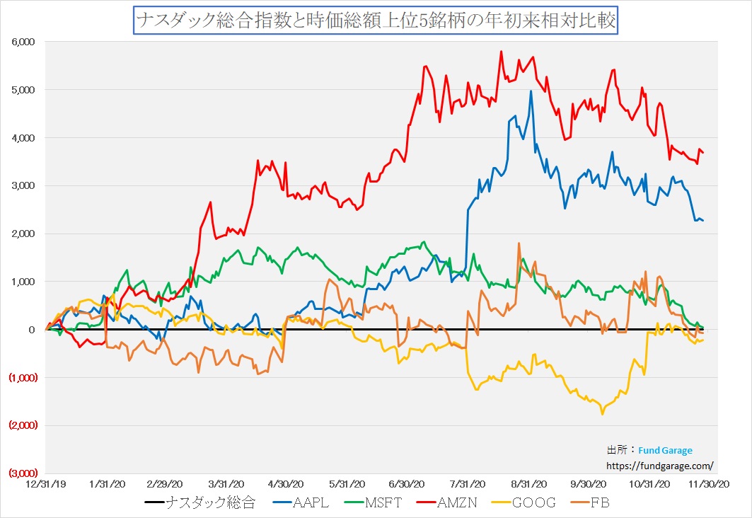 私が秘かにこの先、特に来年を見るのに注目しているチャートをご紹介する。それが下記の「ナスダック総合指数と時価総額上位5銘柄の年初来相対比較」というチャートだ。真中の黒い線をナスダック総合として、ナスダック総合時価総額上位5銘柄(約50%を占める)の動きを相対比較したものだ。
