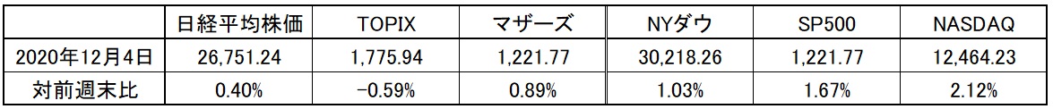 下記の表を見れば、右側の米国株指数3つはどれも最高値更新だと分かるだろう。前述の通り、感染再拡大で「大変だ、大変だ」との日本国内の騒ぎを他所に、米国市場は淡々と史上最高値を更新した。日本での新型コロナウイルスへの悲痛な騒ぎ方から想像すると、米国ではそこら中で医療崩壊が起き、命のトリアージが当然の日常で、人との会食や人が集まるところへの外出などもっての外という状況なのでは無いかと想像されるが、株価はかくも元気に上昇している。(現地視察がこの目で実際に出来ない事が何とも歯痒い)