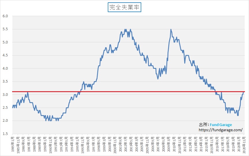 多くのメディアの悲愴感漂うトーンとは違い、実は日本の完全失業率はまだまだ3.1%とかなり低い水準だ。勿論、2019年の終わりの頃、まだ新型コロナウイルスなど影も形も気にせず、暢気に「2020 Tokyo オリンピック」などと言っていた頃の2.2%などと比べたら「悪化」しているのは事実。だが下のチャートを見て欲しい。総務省統計局のデータより作成した1985年1月からの完全失業率(季節調整済み)のチャートだが、1995年から2016年終わりまでの水準よりも今でもまだ低いことが分かる。だが日経新聞などが引用したチャートはその下にある通り、昨年末の絶好調の時からの短期的な推移だけを抜き出して騒いでいる。