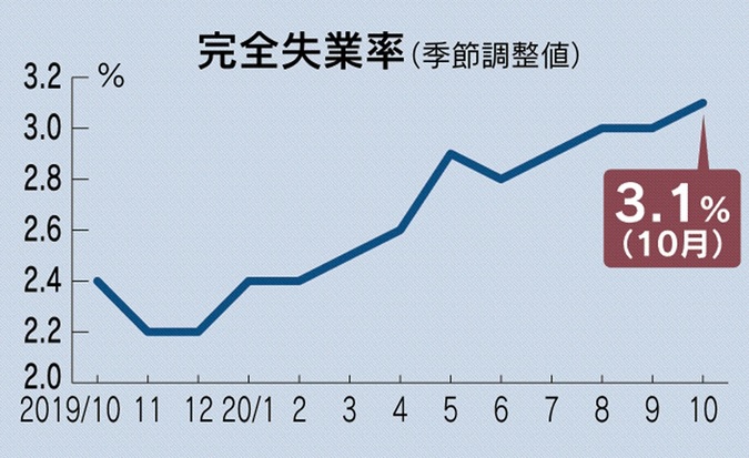 米国WSJ誌が伝えるところによると、米労働省が先週末4日公表した11月の雇用統計では、非農業部門就業者数は前月比24万5,000人増にとどまった。伸びは市場予想の44万人に届かず、10月の61万人から大きく鈍化した。米国の雇用はコロナ危機が発生する前の2月の水準をなお980万人下回っている。失業率は6.9%から6.7%に低下したものの、求職者が減ったことが要因だ。だがこれは人々が就職を断念したか、遠隔授業となった子どもの世話をするために労働力から離脱したことを反映している。そしてこれは11月第2週までのデータで集計されているので、実際は更に悪化しているという話もある。