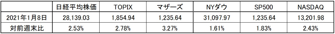 新年がスタートして一週間、下の表にもある通り、株価はどこも調子が良い。日経平均は28,000円台を回復し、NYダウは初の31,000ドル台、ナスダックも13,000ポイント台にのり、尚も上値を追い駆ける。一方で、新型コロナウイルスの感染拡大は世界中で収まるどころか寧ろ第3波で勢いを増している(日本は世界対比では大騒ぎするようなレベルにはなっていない)。更に変異種も登場して猛威を奮う。毎朝データを集計しながらため息が出るほどだ。また西側諸国のリーダーたる米国の新大統領をめぐるいざこざは、現職トランプ大統領の引き際の美学の無さが災いし、民主主義の基盤自体を揺るがせるような事態になっている。2021年は一体どういう一年となるのだろうか?