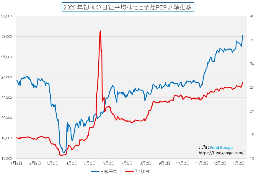 ただバリュエーション的にはかなり正当性は薄れているかも知れない。つまり割高に向かっているということ。下記のチャートが予想PERと株価の推移だ。日経平均の予想PERは週末で26.02倍とかなり高い。これをどう解釈するかでブルにもベアにも成れるだろう。この予想PERは21/3月期の予想EPSに基づいて計算されているが、CY20/9月の中間決算発表時の上方修正は既に凝り込んである。