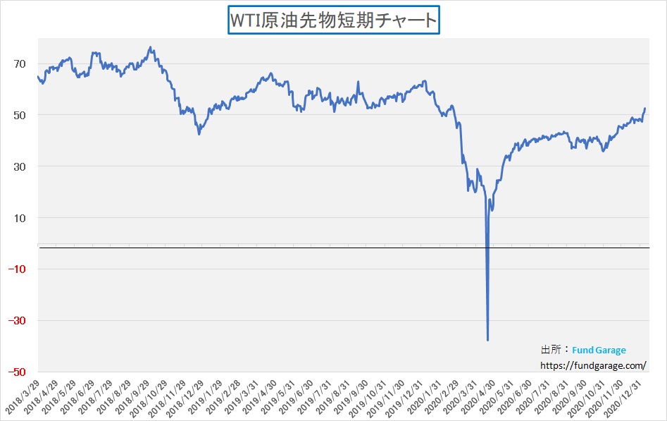 もうひとつ注目しているのが原油価格の動向だ。「脱炭素化社会」に向けて世界が走り出せば、本来ならば原油需要は先細る。だが実際にそうなるのは2030年代では間に合わないだろう。良くても後半。ならば足許はやはり景気動向が需給を左右するので、景気回復を読めば原油価格は上昇する。特にWTI原油先物相場は米国の景況感を反映し易いが、下のチャートのような動きをしている。