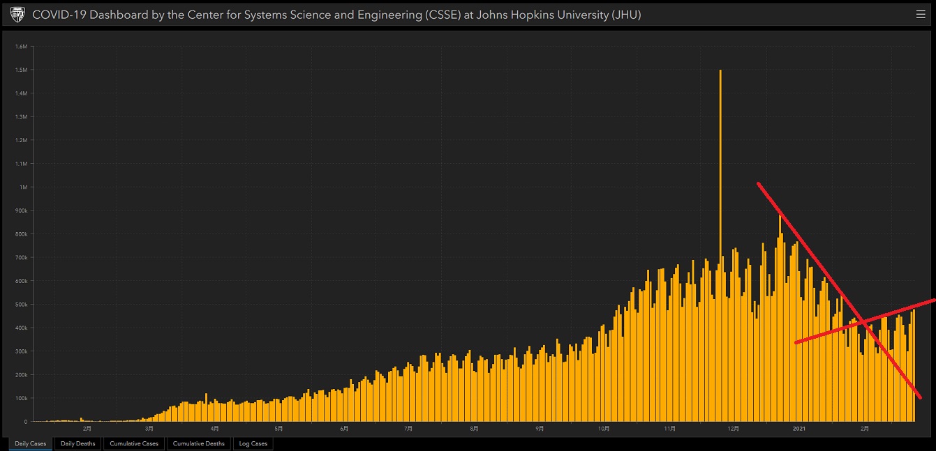 そうした世界の新規感染者数の毎日の動向を端的に確認出来るが下記のチャートだ。ファンドマネージャーの性として、直ぐに傾向線を引いてしまうのだが、確かに一時は減少傾向を辿り、更にそこからワクチンへの期待値も高まったが、最近の状況は傾向線は右肩上がり、すなわち新規感染者数が増加傾向にある。これがワクチンの普及で期待されているように急低下するのかどうかは、はっきり言って「God Knows!!」と言って良いだろう。なぜか?既にワクチンも特効薬のタミフルやリレンザなどがある季節性インフルエンザでさえ、毎年流行し、超過死亡概念で捉えると「インフルエンザによる年間死亡者数は、世界で約25~50万人、日本で約1万人と推計されています。」と厚労省が正式に発表しているのだから。