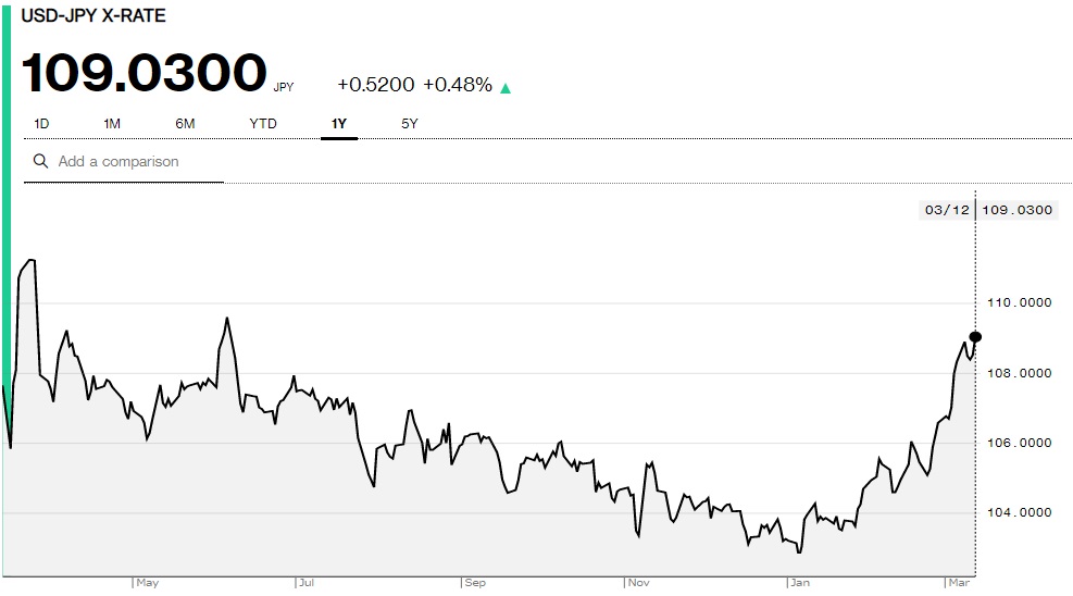 先週も為替の事については振れさせて貰ったが、実は気になってみているからこそコメントさせて貰った。下のチャートを見て頂こう。これはドル円の過去1年間分の推移だが、昨年は明らかに円高が続いていたが、今年に入り見事に為替は反転している。私はドル円の本来的な均衡点は昔から1ドル=110円前後と思っているが、俄かにその水準に近付いてきた。