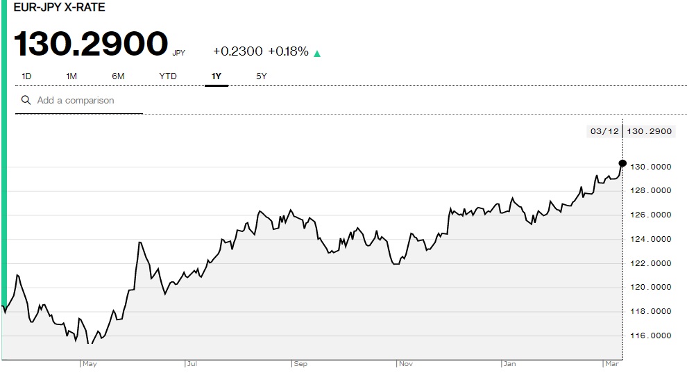 実は気になっているのはドル円だけではなく、対ユーロや対英国ポンドなども気になっている。下のチャートがユーロ円の過去1年間のチャートだ。対ドルとは違って、対ユーロでは昨年も円安だったのだが、ある意味では対ドルと対ユーロでは逆の動きを昨年はしていた。それが今年は共に円安となっている。実はこれは対英ポンドでも同じで、足許先週末では1ポンドが152円台と数年振りの水準をつけている。つまり、円は多くの通貨に対して弱くなっているという事だ。