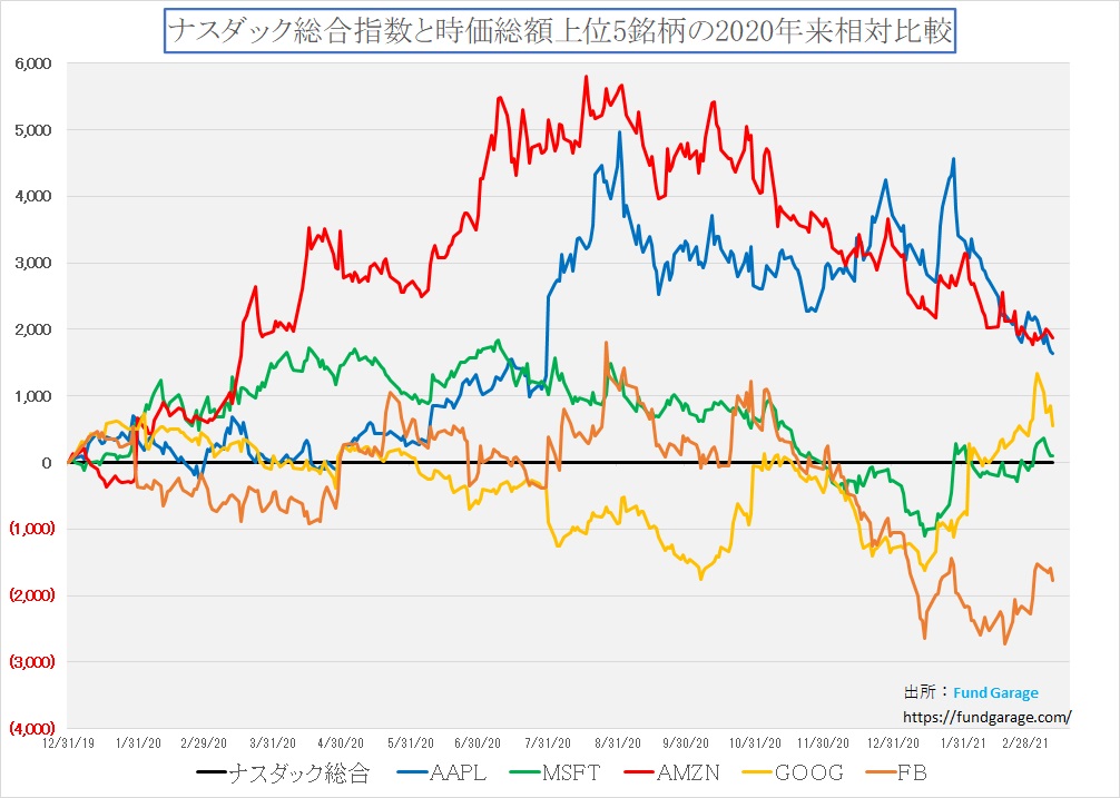 面白いのは、パンデミックの中の巣篭もり消費により一番恩恵を受けたと思われているアマゾン・ドット・コムは、既に昨夏8月の終わりにはNASDAQに対して足引き役になっている。アップルも昨夏8月には気を吐いたが、実はそれ以降は鳴かず飛ばず、そして今年に入ってからはかなりな足引き役だ。フェイスブックもマイクロソフトも同様と言える。グーグルだけが今年に入って暫く気を吐いたが、足許では足引き役に転じている。