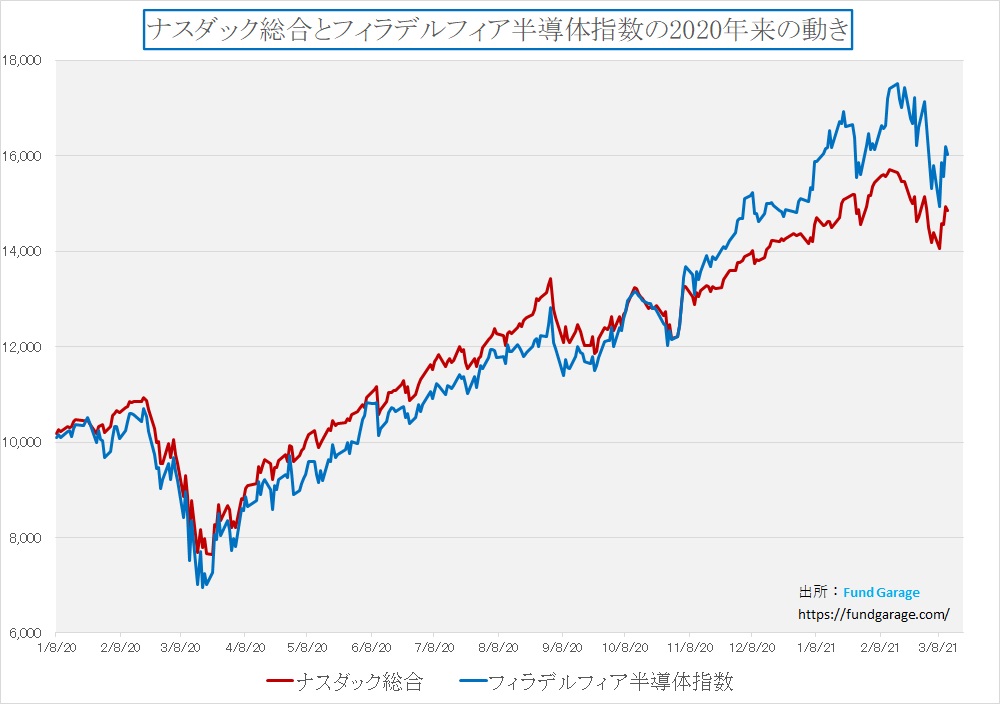 ならば何が先導しているのかと言えば、「GAFA+M」のあと、2月中旬までは「半導体関連銘柄」がリードしたことは、NASDAQとフィラデルフィア半導体指数の推移を見て貰えば一目瞭然だ。だが、それも足許では全く牽引役とはなっていない。個別銘柄で見ても、特段のリード役が居るというよりも、個別にリターン・リバーサルを繰り返しているようにも見える。