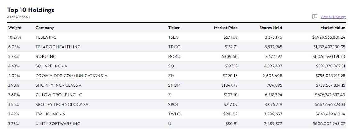 そして下記のリストがARKの代表的なETFである「ARK INNOVATION ETF」の直近の組入銘柄だ。このファンドは通常35から55銘柄しか保有しないと謳っている。まず内容の前に注目なのが、左肩の「Top 10 Holodings」の下にある「As of 5/14/2021」という表示だ。お分かりの通り、最新のデータは毎日発表になっている。画像クリックでPDFの全銘柄リストが表示できるようにしておいた。ここまでディスクローズを徹底している姿勢は、私と同じ発想で非常に好感が持てる。私も正に自分が運用するファンドの組入は全銘柄を投資比率付きで開示していたからだ。