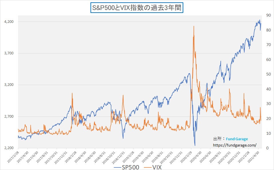 もう一枚は同じくS&P500とVIX指数のチャート。こちらも綺麗に負の相関関係を証明しており、一旦はハイテク株の売りは終わったことを示唆している。