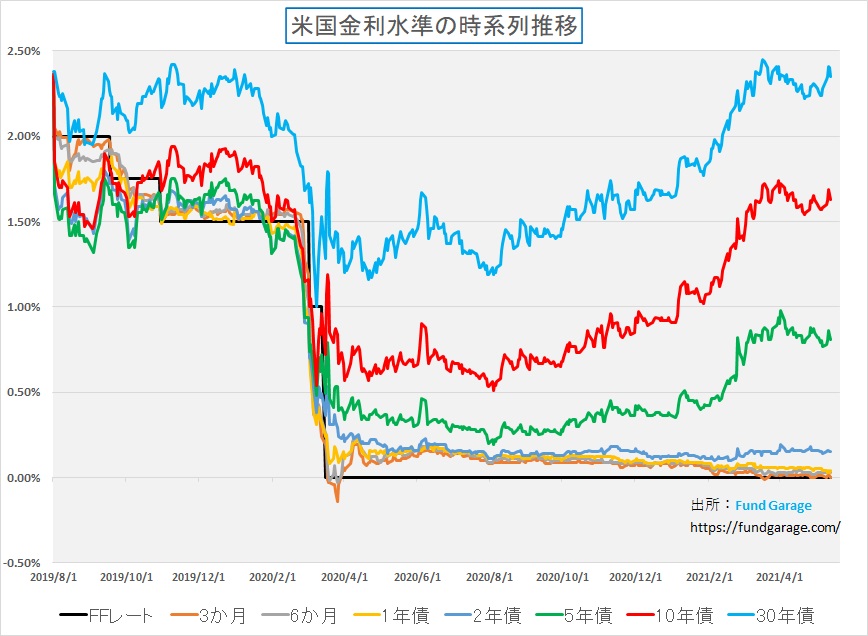 ならば何故、5月に入ってからの米国株市場はドタバタしているのだろう。金利上昇の話をするコメンテーターがいる。或いは「巣篭もり関連銘柄が売られた」と評する解説がある。だが金利上昇というには限定的にしか金利は上昇していない。巣篭もり関連銘柄というには範囲が広すぎた。ならば何が実際は起こっているのだろうか?念のため、金利動向のチャートをお見せして置く。左側のY軸のメモリをよく見て考えて欲しい。これで金利が上昇したと騒ぐ必要があるのだろうか?