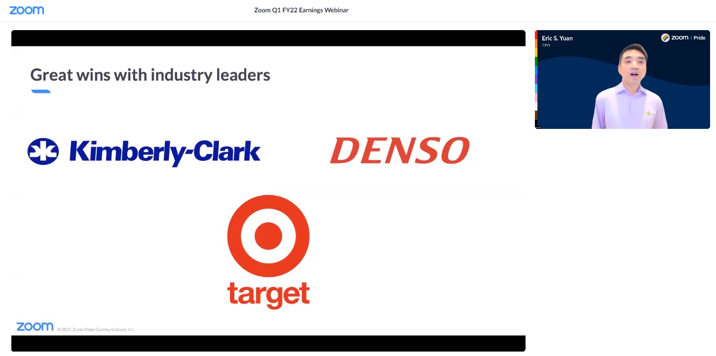 さすがズーム、決算説明は質問するアナリストも含めてウェビナー形式で同社のWebサイトで視聴可能だ。質問するアナリストの顔までが画面一杯に拡がる様は過去には見たことがない。そしてその多くが背景から在宅勤務をしているように見える。出来れば下記の画像をクリックして、実際のウェビナーを見て頂ければと思う。画像はちょうど始まって7-8分が経過した辺り、CEOのERIC Yuan氏が同社のシステムを導入した大企業を例示して説明しているところだ。下のバーをスライドさせれば、質疑応答のところまで飛ぶことも出来る。
