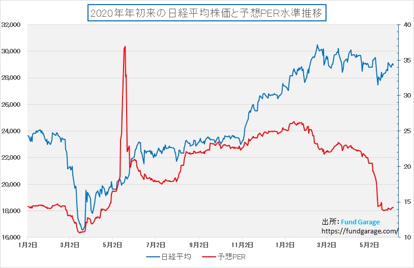 日経平均が29,000円に絡む中で、週末のNT倍率は14.7倍。今年の1月から2月の時とは全く違う状況で日経平均は上がってきていると言える。またPERが現在値段で12.39倍のトヨタ株が上昇しても、日経平均全体のPER上昇にはほとんど寄与しない。何故なら日経平均のPER自体がそれよりも高い14.24倍だからだ。従って下記のチャートが示すように、市場の過熱感にはバリュエーション上も影響してこない。