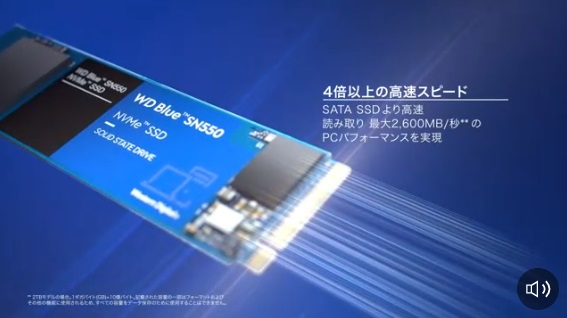 M.2とは接続端子の規格のこと。これらを総合して「512GB SSD (PCIe NVMe M.2)」と言えば、自然と頭に下の図のようなものが浮かび上がるようになったら、相当詳しくなってきた証拠。この写真では、文字で書かれた4倍以上の高速スピードという点を見て欲しい。従来のSATAという接続方式は、HDDの読み書き速度の限界値が上限となっていたので、その限界を外すとこれだけ早くなるということが書いてある。因みに、ものはウェスタンデジタル社のものだ。