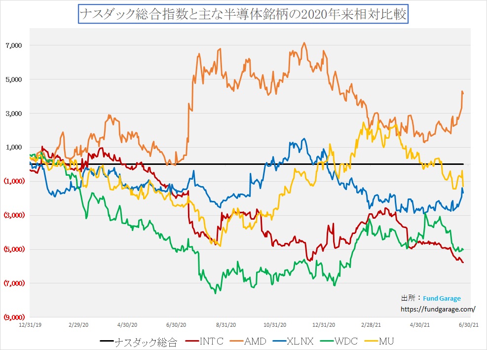 上のチャートは半導体主力銘柄の対ナスダック総合に対する相対パフォーマンスを示しているが、赤色で示したインテルは新CEO登場直後こそ一旦元気づいたものの、もう3か月以上はアンダーパフォームだ。一方でAMDとザイリンクスは調子がいい。残念ながらメモリー系は評価が低い。理由を挙げるとすれば、半導体不足でデバイス類の出荷が遅れれば、当然メモリー半導体もDRAMであれ、NANDであれ、販売が止まるだろうということだと思うが、今回のマイクロンテクノロジーの決算発表でそれは無いと確認された。あとは市場の見方が変わるのを待つだけだと思われる。