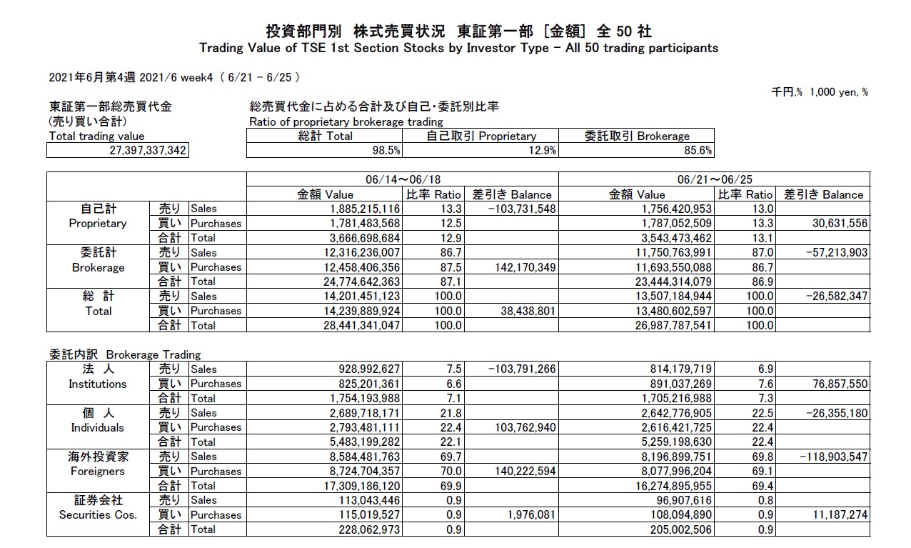 更に言えば、6月30日と言えばCY(カレンダー・イヤー:暦年)で2021年上半期の最終日だ。日本はFY2021(フィスカルイヤー)と書く「会計年度」を中心に考える国とは言え、もう少し何か動きがあっても良いだろうと思われた。だがその最大の理由を探ると、投資主体の殆どが海外投資家になってしまったからだと気が付く。今、日本の株式市場において、委託取引(注文を受けて執行する取引)の内訳を「法人」、「個人」、「海外投資家」そして「証券会社」と分類した場合、「海外投資家」の比率が概ね何割に及ぶかご存じだろうか。
