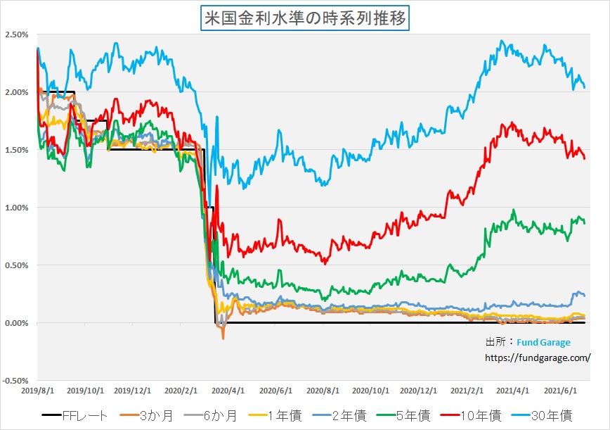 先週末に発表された6月の雇用統計は非農業部門雇用者数が前月比85万人増と、前月の58万3000人増から伸びが加速する一方、失業率は5.8%から5.9%に悪化した。これを受けて米国債利回りは一時的に上昇したものの、その後は押し戻される動きとなり、終わってみると10年債の利回りは1.42%と3月1日以来の水準に低下して終わった。30年債利回りは2.04%とほぼこのところの最安値に近い。テーパリング開始や早期の利上げ再開を予想していた悲観論者には残念な結果になったようだ。Fund Garageの見通しは正しかった。