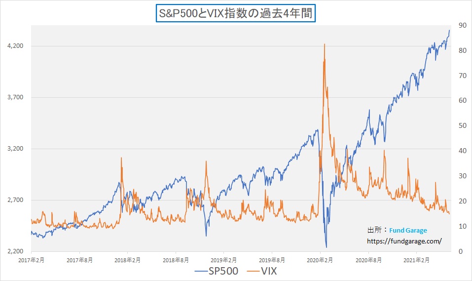 ただこれも米国市場のこのところの推移を見ると仕方ないとも思えてしまう。下のチャートを見て頂こう。S&P500とVIX指数(恐怖指数)の2017年からの4年超の推移を辿ったものだ。まず明らかなことは、昨年の3月下旬のパンデミック・ショックの急落からそろそろ2倍になりましたという声が聞こえそうなところまで、僅か1年余りで株価が駆け上がってきたということだ。この上昇を見れば、高所恐怖症になり、バブルだと大騒ぎをしたくなる人が出てくるのは仕方ないかも知れないとも言える。その位、青い線の上昇角度はこの一年見事な右肩上がりだ。(注:私は米国市場がバブルだとは考えていない)