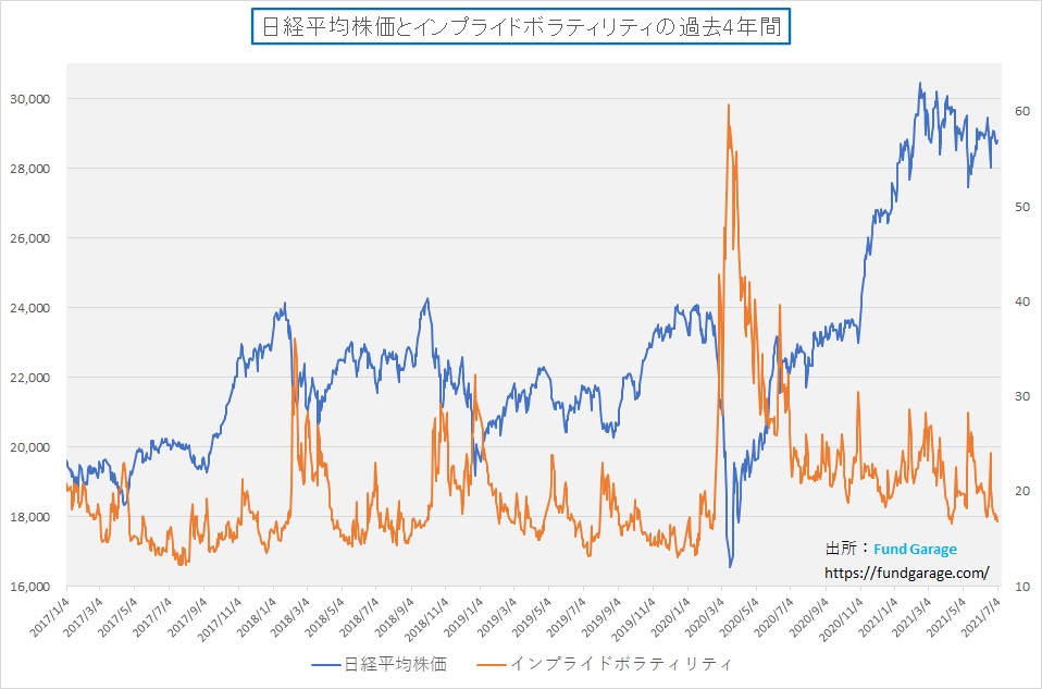 不甲斐なく、ある意味情けなくなるのは日本市場の現状だ。前述の米国市場の動きに比べると、このところの動きは非常に悪い。まず株価とインプライド・ボラティリティの推移を見て頂こう。前掲の米国S&P500が示した情報に突き抜ける勢いは全く見られない。これは日経平均とそのインプライド・ボラティリティを併記したチャートなので、S&P500との比較には適していないというご批判があるかも知れない。