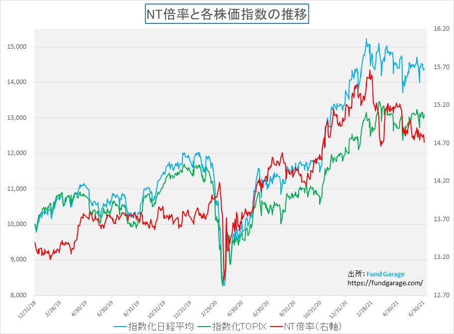 そこでもう一枚、NT倍率(日経平均÷TOPIX)のチャートをお見せしよう。今回のチャートでは、青線が日経平均、緑線がTOPIX、そして赤線がNT倍率を示している。S&P500と同じ立ち位置のTOPIXであるが、TOPIXも3月21日以降、もみ合いながらトレンドは下落方向だ。日経平均の下落の方が大きいのでNT倍率が14.71倍とかなり低下して良い方向になってきているのは確かだが、米国経済の指標を見ながら、米国市場ほど活況ではない。