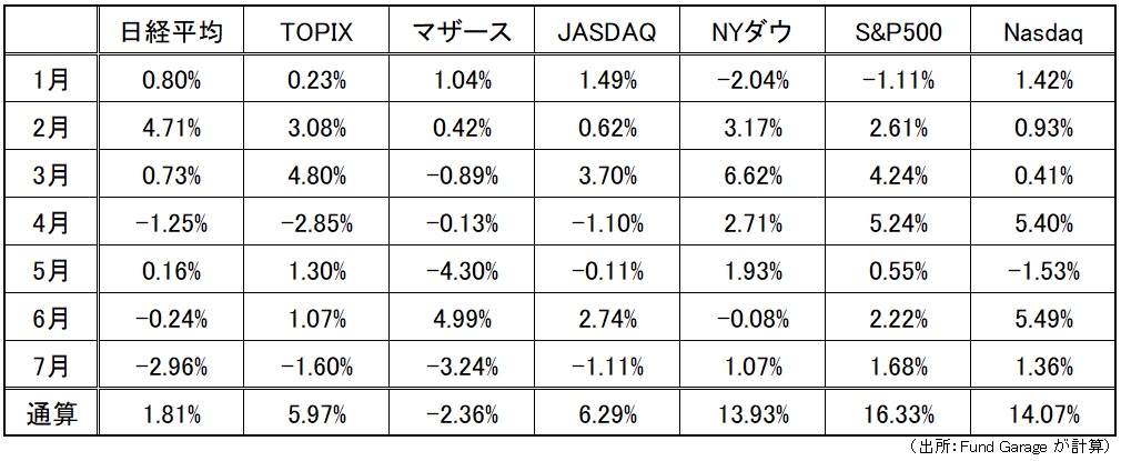 実はこれ、年初来(年初来の騰落率であって、各月の合算値という意味ではない)でみると、日本市場は米国市場にかなり置いてきぼりを食らっているのが更に良くわかるようになる。下の表、最下段の年初来騰落率の「通算」の欄をよく見て欲しい。パフォーマンスの比較で言ったら、日本は完膚なきまでに負けている。東証一部の約7割が外国人投資家である一方で、日本の個人投資家が約6割を占めるマザーズに至っては、通算騰落率がポジティブにさえなっていない。